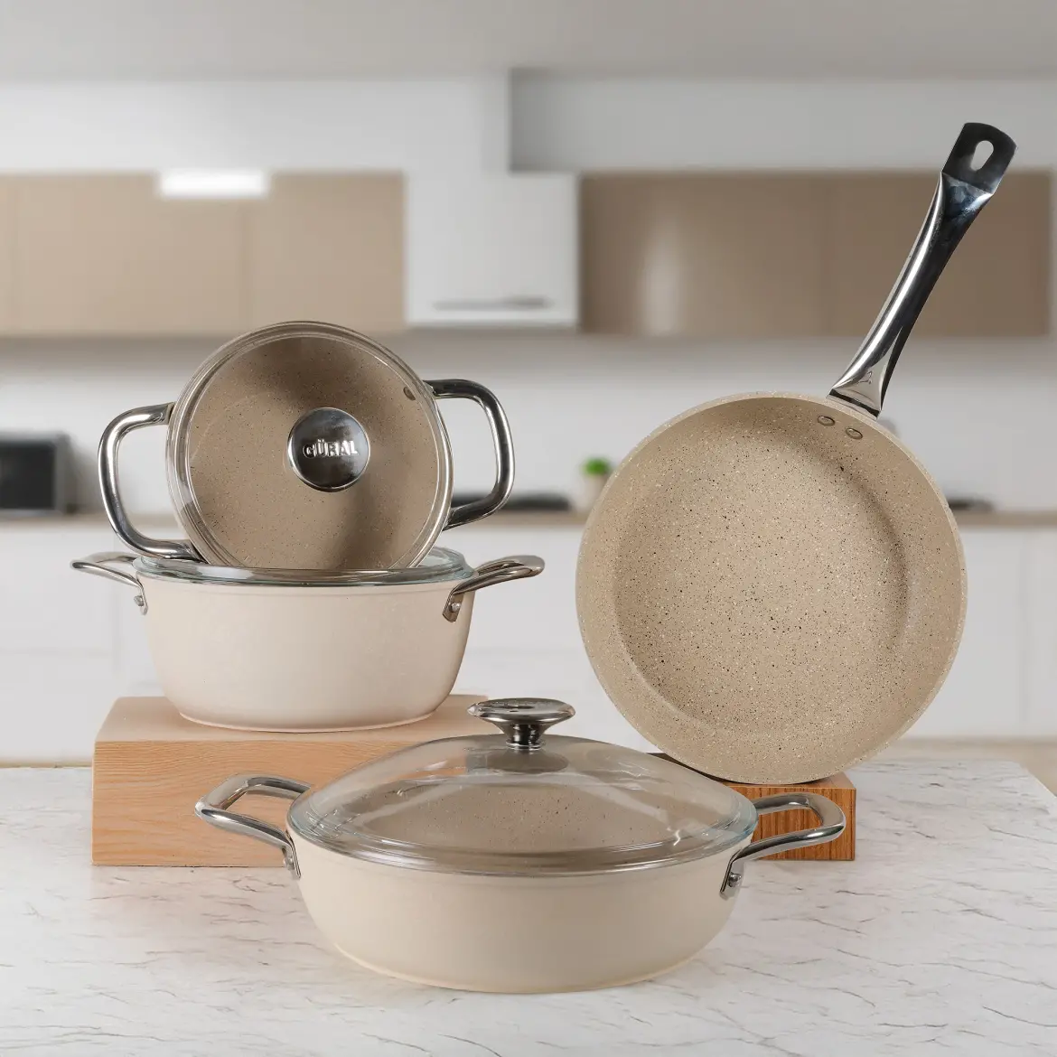 Dayanıklı granit kaplamasıyla uzun ömürlü kullanım sunan bu 7 parçalık tencere seti, sağlıklı ve lezzetli yemekler pişirmeniz için tasarlanmıştır. Yapışmaz yüzeyi sayesinde minimum yağ ile pişirme imkânı sağlar. Isıyı eşit dağıtarak yemeklerin tam kıvamında pişmesini destekler. Modern tasarımıyla mutfağınıza şıklık katar.