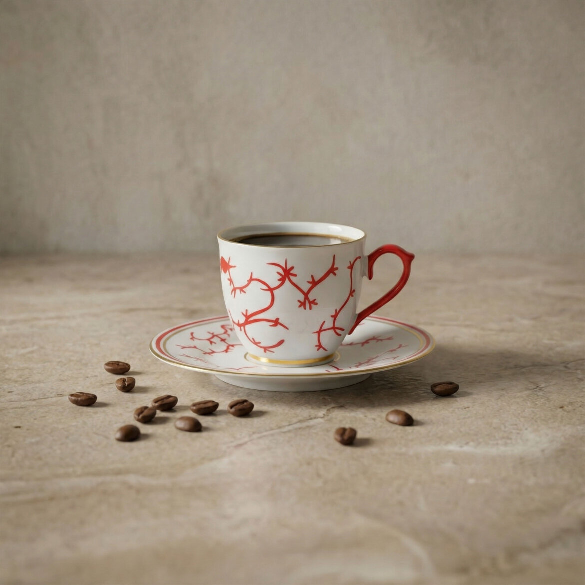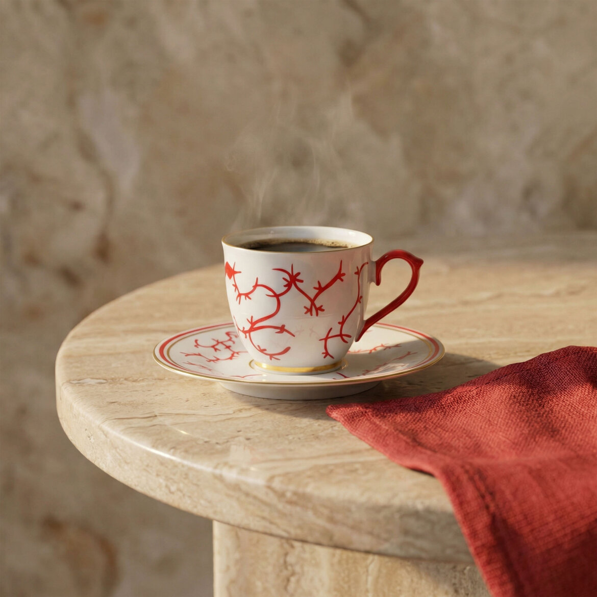 El dekoru detaylarıyla tasarlanan porselen kupa, özgün desenleri ve parlak yüzeyiyle dikkat çeker. Kırmızı tonlardaki zarif el çizimi motifleri sayesinde modern ve dekoratif bir görünüm sunar. Günlük çay ve kahve keyfinize estetik bir dokunuş katar.